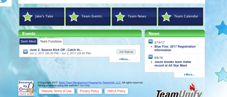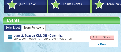 You can also access the Job Sign Up button by going to the home page and under the events tab you can see the tabs for Meets and Team Functions. Here is an example of a team function (the season kick off party):