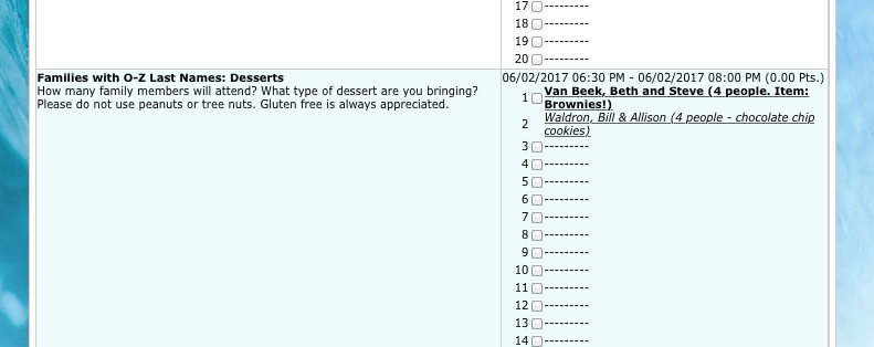 And after you have signed up, you should be able to see your commitment. Pulling from the season kick off event, here is an example of what you might see after you complete the Job Sign Up and click "save":