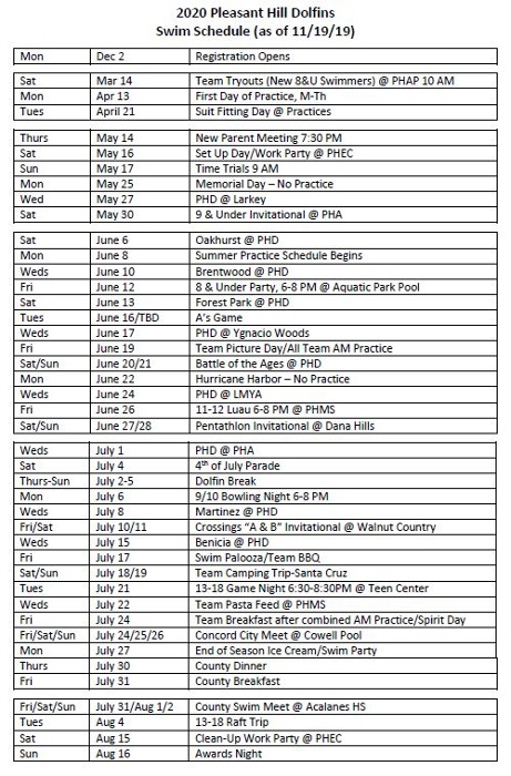 Please check our out 2020 schedule (attached) and plan ahead for an awesome season! Please contact Coach Talli if you would like to take the lead on any of our social events or be an Age Group Parent/Coach Liaison.
