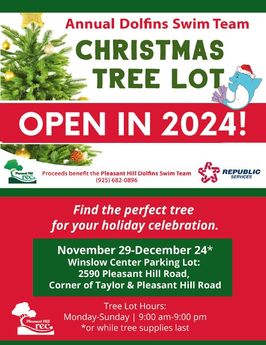 The Dolfins Tree Lot is open now through December 24 (or while tree supplies last) at the Winslow Center Parking Lot, 2590 Pleasant Hill Road. Support the Dolfins Swim Team while you find your perfect tree!