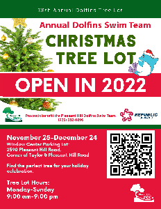 Greetings Dolfins families! We hope you are all doing well and are gearing up for a fabulous Thanksgiving holiday followed quickly by the Christmas season!!! We are excited to report that the Dolfin Christmas Tree Lot is back!!! Starting on November 16th, if any high school age swimmers are interested and available to work at the tree lot, feel free to show up in the afternoon and the tree company staff can give you the drill! Info on the lot itself is attached. Have a wonderful day and stay tuned...