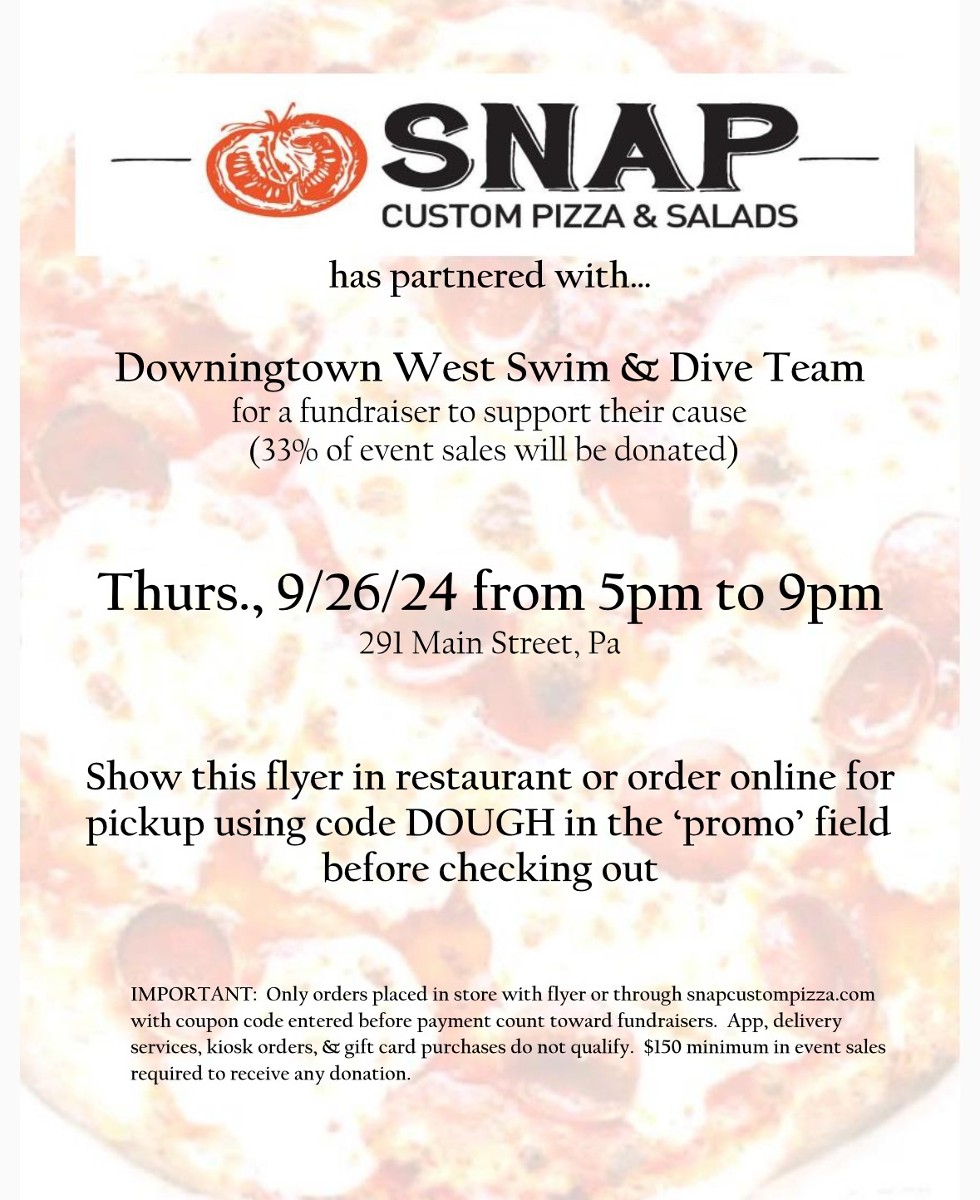 Please join us for our first fundraiser of the season! 33% of all sales will be donated to the Downingtown West Swim & Dive Team. Please bring the flyer posted above with you or use the code DOUGH in the "promo" field if ordering online. We hope to see you there!