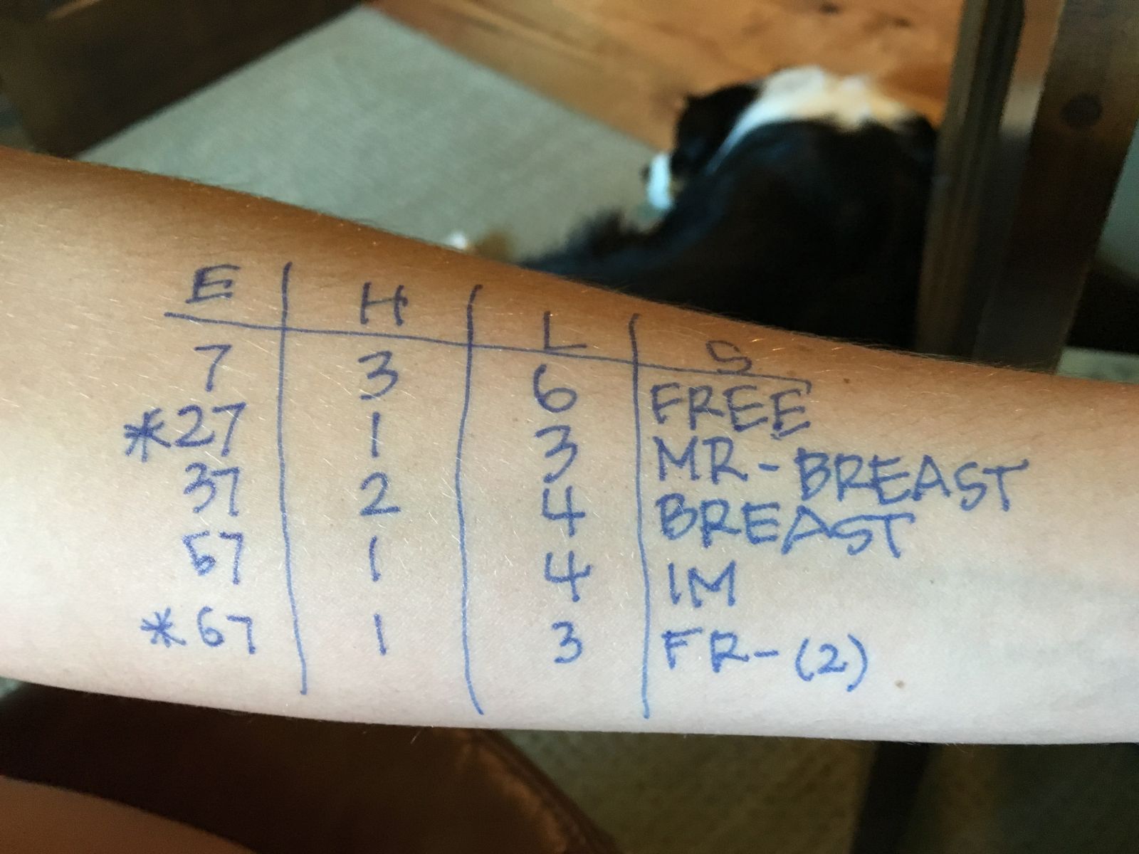 Your swimmer’s event info would appear in this format on your swimmer’s forearm, listing all events for your swimmer. Events are listed in ascending order (i.e. event #3 would be listed before event #12).