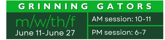 There will be TWO separate sessions of GG that run concurrently. You must choose one session and cannot switch back and forth. This is to maintain the correct numbers and make sure we have the right amount of coaches to keep everyone safe and progressing. We recommend swimmers come to every practice in your session and we ask that you drop your child with their coach and then give your child plenty of room to learn (ie do not sit directly behind them or continue to talk to them while they are in the pool!). There are a total of 10 practices for GG and we will make every effort to have makeups for weather etc. GG Spots are limited and when sessions fill up, which it has for the last two years, we will move to a waiting list. For more info on Grinning Gators and Swim team, please click here: GATOR GUIDE.