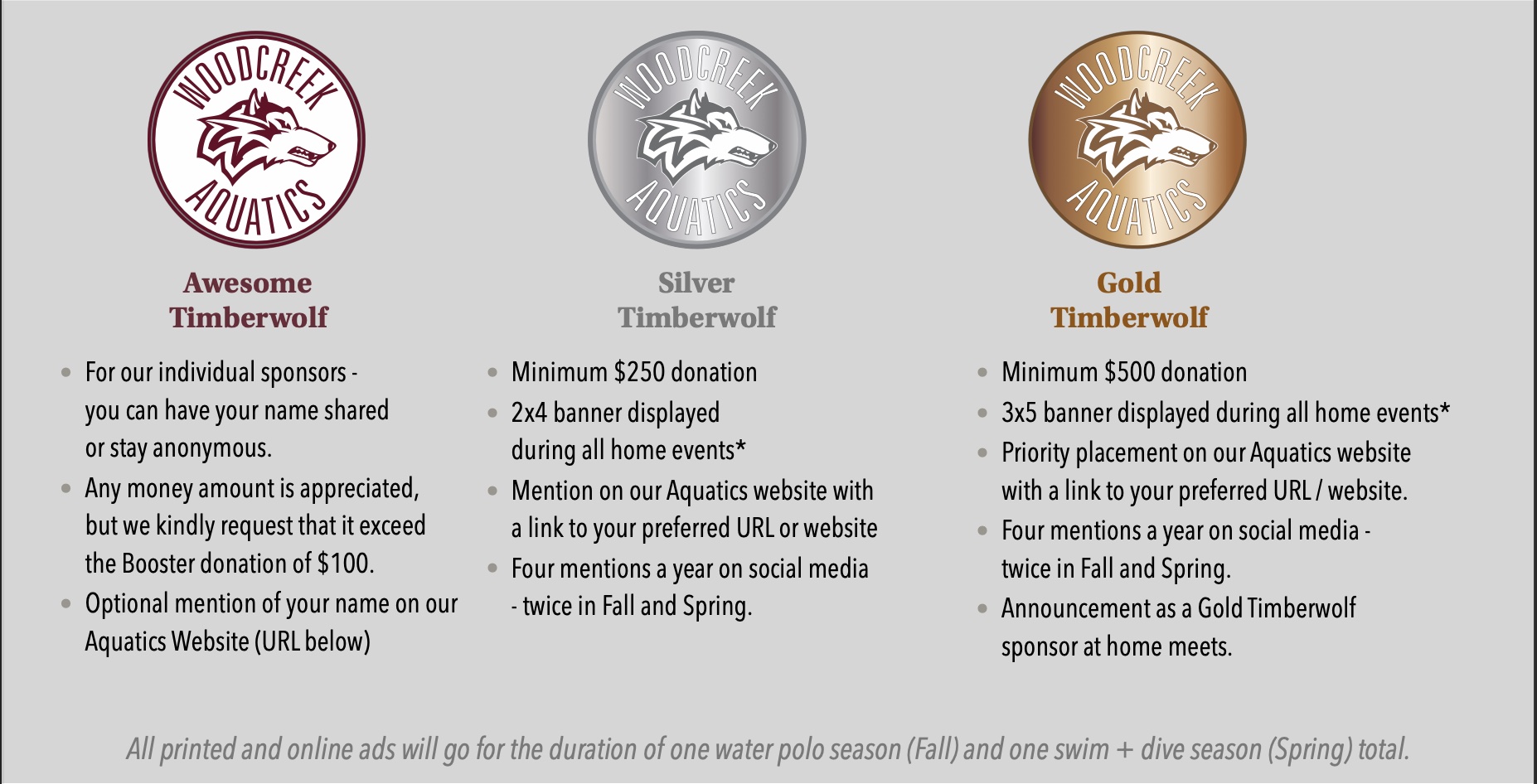 Each level above will receive one season of advertising / mentions for both water polo (Fall) and swim + dive season (Spring) advertisement in the spots mentioned above. Please reach out to the email below for a donation letter with EIN to be provided.
