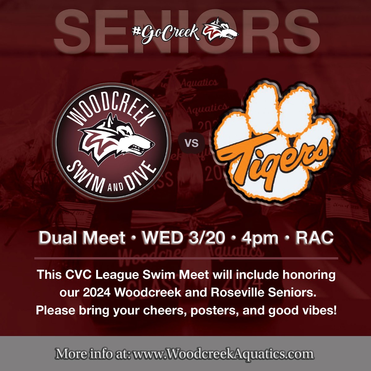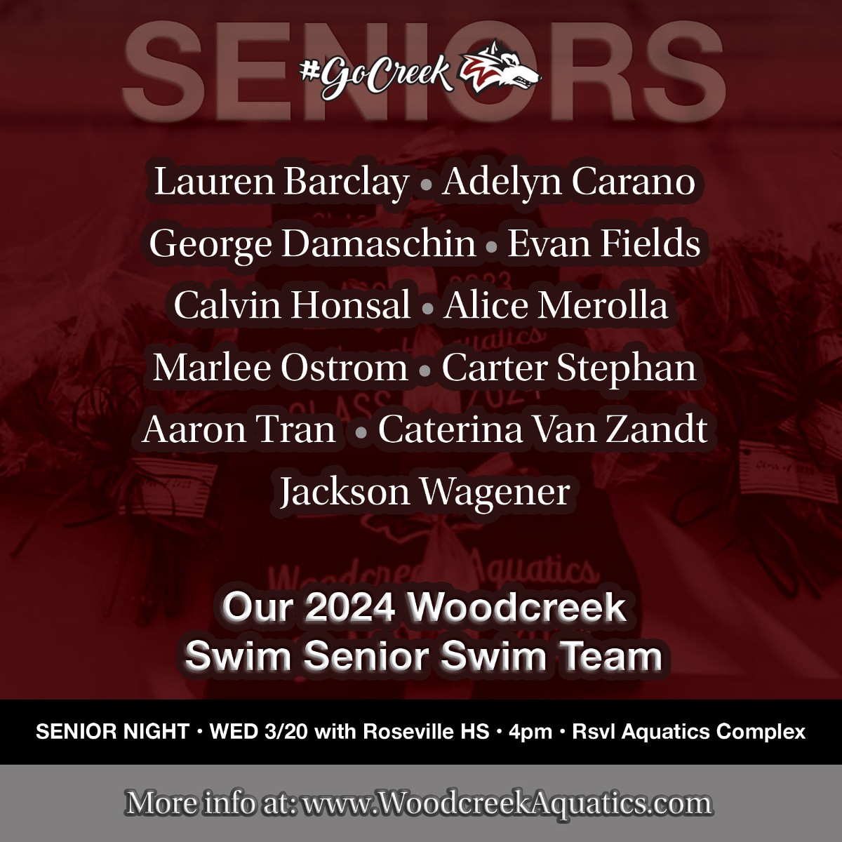 Non-Seniors ATHLETES + Senior Parents - please bring signs and cheers for our graduating Seniors as we celebrate their years in the Woodcreek H.S. Aquatics program