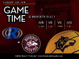 Rocklin at Woodcreek - Thursday 9/19 JVB 4pm • VB 5pm • VG 6pm • JVG 7pm Game is hosted at the RAC JV Boys - Early Release at 2:45PM Please try to be there for all squads for cheering and supportive dialogue. Remember - no artificial noisemakers on the pool deck. Please be respectful to the officials. Wear your team Nike polos on game days. GATE Gate fees for the game are as follows: General Admission $8.00 Student/Child*/Senior/Military $5.00 *8yrs and under are free Cash or Venmo accepted We...