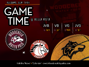 Woodcreek @ Bella Vista HS - Tuesday 9/17 JVB 4pm • VB 5pm • VG 6pm • JVG 7pm Game is hosted at Bella Vista High School Bella Vista High School 8301 Madison Avenue Fair Oaks, CA 95628 JV Boys - Early release at 2:30PM All athletes should be at games 1 hour prior to their game time. However, if you can please try to be there for all squads for cheering and supportive dialogue. Remember - no artificial noisemakers on the pool deck. Please be respectful to the officials....