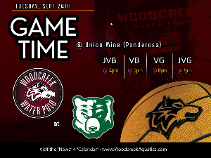 Woodcreek @ Ponderosa (Union Mine HS) - Tuesday 9/24 JVB 4pm • VB 5pm • VG 6pm • JVG 7pm Game is against Ponderosa but hosted at Union Mine School Union Mine High School 6530 Koki Ln El Dorado, CA 95623 JV Boys - Early release at 2:00PM All athletes should be at games 1 hour prior to their game time. However, if you can please try to be there for all squads for cheering and supportive dialogue. Remember - no artificial noisemakers on the pool deck. Please be respectful...