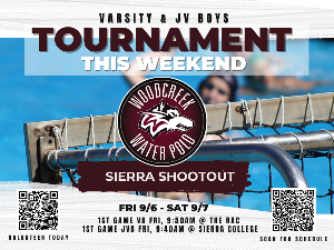 18th Annual Sierra Shootout / Chuck McCollum Invitational September 6th and 7th, 2024 Link to Brackets $7 per spectator admission will be charged at each pool - each day. Varsity Boys are currently in the Platinum Bracket - F1 1st game for Woodcreek VB is Fri @ 9:50AM at the R.A.C. JV Boys are in the Bronze Bracket CC CC3 1st game for JVB is Fri @ 9:40AM at Sierra College Coach D'Arienzo issues Early Release Items For Questions re: Boys Schedule and Sierra Shoot-Out - please direct to Coaches...
