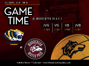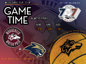 It's a 747 Showdown! Woodcreek @ West Park - Wednesday 9/11 JVB 4pm • VB 5pm • VG 6pm Game is hosted at West Park High School West Park High School 2401 Panther Place Roseville, CA 95747 JV Boys - Early release at 2:45PM All athletes should be at games 1 hour prior to their game time. However, if you can please try to be there for all squads for cheering and supportive dialogue. Remember - no artificial noisemakers on the pool deck. Please be respectful to the officials. Wear...