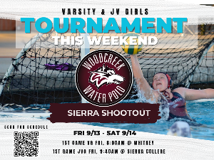 29th Annual Sierra Shootout / Chuck McCollum Invitational September 13th and 14th, 2024 Link to Brackets $5 per spectator admission will be charged at each pool - each day. Varsity Girls are currently in the Platinum Bracket - G1 1st game for Woodcreek VG is Fri @ 8:000AM at Whitney High School JV Girls are in the Bronze Bracket CC CC3 1st game for JVG is Fri @ 9:40AM at Sierra College Coaches issue Early Release Items For Questions re: Girls Schedule and Sierra Shoot-Out - please direct to Coaches...