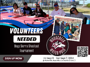 On Friday Sept 6 to Sat Sept 7, 2024 Woodcreek Water Polo is one of the pools involved in hosting the Boys Sierra Shootout Tournament. Therefore, we are in need of volunteers to help with the desk and collect money/venmo at the gate. No experience necessary, we have amazing volunteers available to help train you if necessary. Students who are looking to earn volunteer hours can also assist at the gate. You can sign up via the Sign Up Genius: HERE or scan the QR code below Thank You! To...