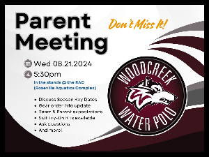 Water Polo Parent Meeting Woodcreek Water Polo Schedule 2024 - Click to Visit the Spreadsheet version of the Game Calendar View Water Polo page (click) for FAQs If you missed the parent meeting - here's the PDF handout that was passed out We are excited to announce a mandatory meeting for all parents of 2024 Woodcreek Water Polo athletes. The meeting will take place on Wednesday, August 21st, at 5:30 PM in the stands at the Roseville Aquatics Complex (RAC). During this meeting, we will discuss essential information regarding the...