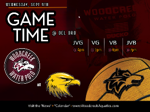Woodcreek @ Del Oro - Wednesday 9/4 JVG 4pm • VG 5pm • VB 6pm • JVB 7pm Game is hosted at Del Oro High School Del Oro High 3301 TAYLOR RD LOOMIS, CA, 95650 JV Girls - Early release at 2:30PM All athletes should be at games 1 hour prior to their game time. However, if you can please try to be there for all squads for cheering and supportive dialogue. Remember - no artificial noisemakers on the pool deck. Please be respectful to the officials. Wear your team...