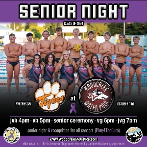 Senior Night and Play4TheCure Night Water Polo Night • Senior Night • All Squads • CVC League Match **CORRECTED SCHEDULE** for 10/11 game JVB 4pm • VB 5pm • Senior Recognition • VG 6pm • JVG 7pm Roseville Tigers vs. Woodcreek Timberwolves • Roseville Aquatics Complex Wednesday, October 11th this post was updated on 10/8/23 Athletes wear your Senior Night / Bruce Shirt to school in lieu of Nike Polos for game day (if you have one). If you don't - just wear your Nike Polo. Parent(s) and families -...
