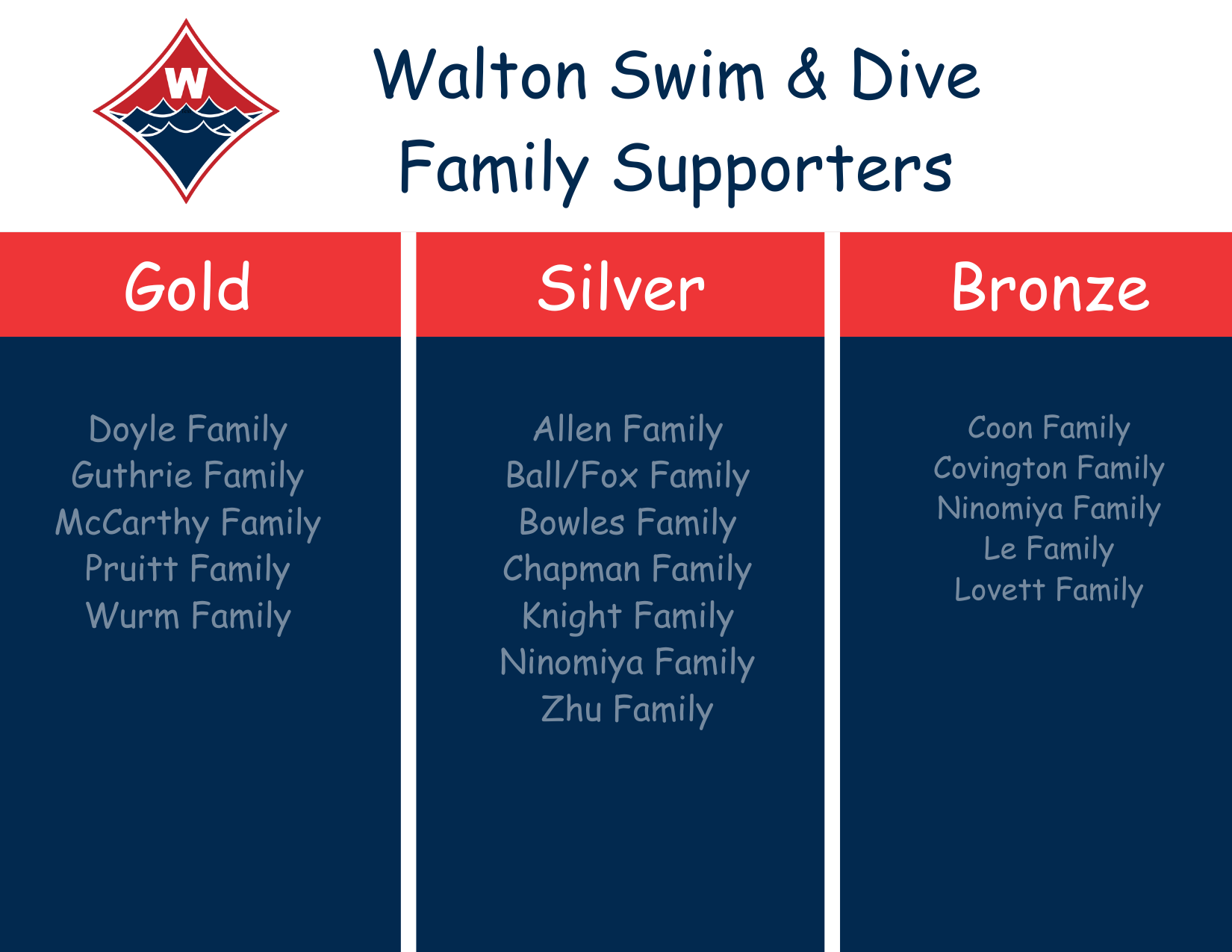 100% of all monies received by the Booster Club goes directly to the Walton Swim & Dive program to offset the continuing rising costs of CAC’s and MVAC’s pool rentals for practices and meets, costs associated with 2-3 meets hosted by Walton, to pay officials, purchase equipment, pay for coaching staff, meet participation fees and many other activities that benefit your athletes.