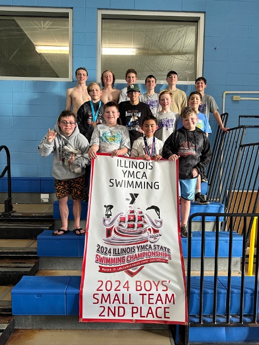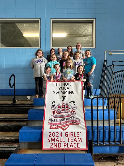 The Illinois Valley YMCA Dolphin swim team took 26 swimmers to the IL YMCA state swim meet March 8th-10th, 2024 at Lake Central High School in St. John, Indiana. Due to a reorganization of Large and Small teams at the state level, the ILVY Dolphins are Small Team State Champions!