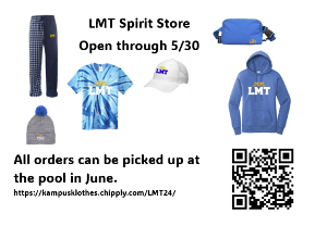 LMT swimmers and divers- the spirit store has launched and will be open through midnight on Thursday, May 30th. Please see the attached store flyer as well as the website (and QR code) to order. Link: https://kampusklothes.chipply.com/LMT24/ This is the only spirit store we will have this season so if you want to order any LMT gear this is your time to do it.