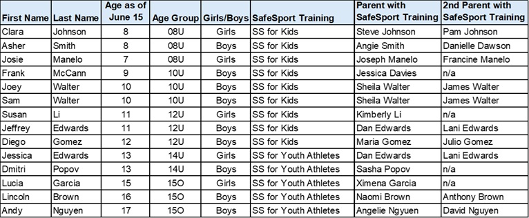 It is very common for children to complete their SafeSport training courses under a parent's account. Check for the SafeSport youth and kids training courses under the parent's name and email in the reporting system. Remember that some children's last names can differ from their parents' last names. Your team roster should be able to identify parent and child names - ask your club manager or head coach for a complete roster.