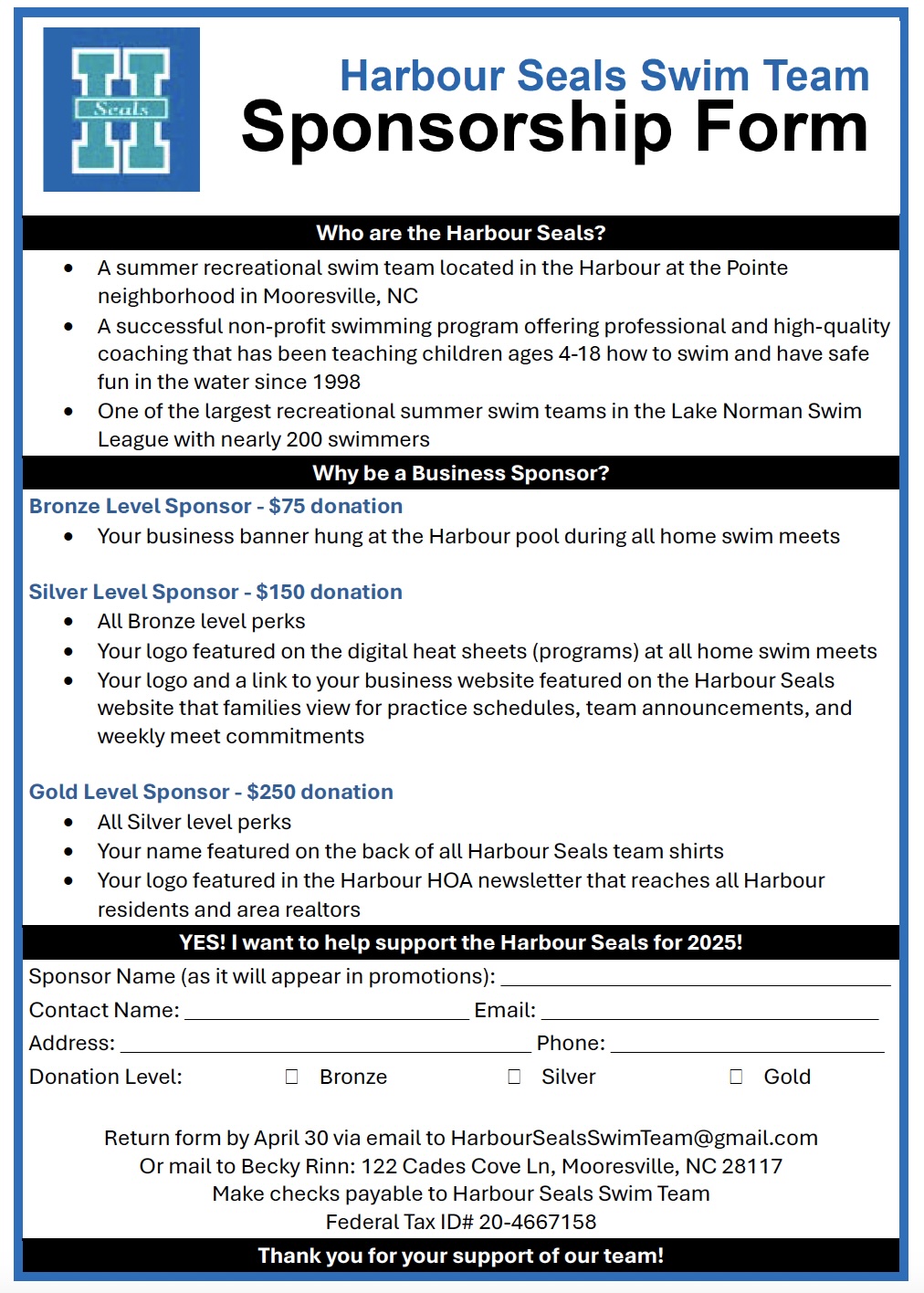 The deadline to participate as a Harbour Seals sponsor is April 30, 2025. Please see the donation form below for more details about how you can help support the Harbour Seals! On behalf of the Harbour Seals, we thank you for your consideration. If you have any questions, please contact Team Director Becky Rinn at [email protected]
