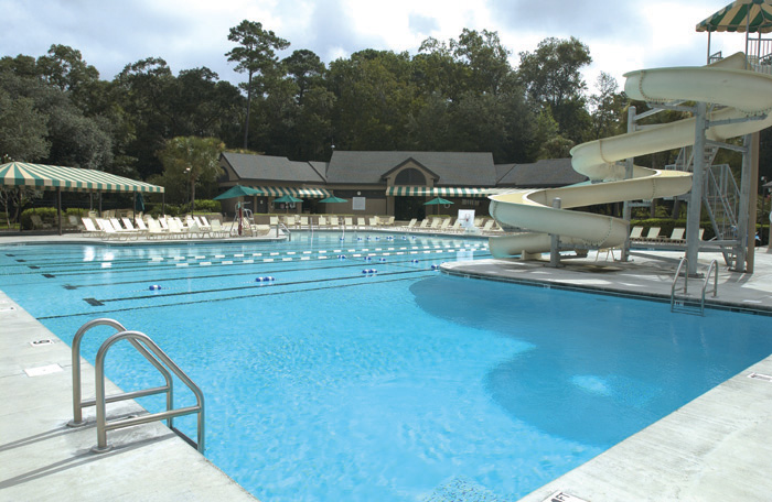 From Montgomery Cross Road, take Waters all the way out. You will stay on the road for a few miles. Waters turns into Diamond Causeway and you will go over two bridges. Once on Skidaway Island, stay straight and go into the Landing through the main entrance (past the stop sign). Once in the main gate, bear to the right at the fork in the road. Go short distance to Franklin Creek on the right. The pool is next to the tennis courts. Look for the big water slide.