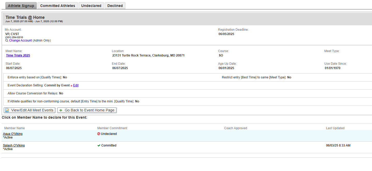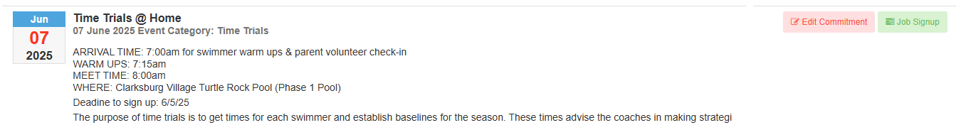 - Click the red "Edit Commitment" button to indicate your swimmer’s availability. If you do not see this option, check back later as the meet is unavailable for entries yet.