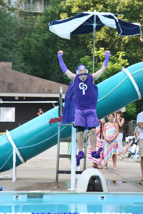 Captain Purple Appears David De Grazia (class of 1982) becomes the first to don the purple costume and jump off the high dive before meets. In the 1980′s the tradition is continued by Andy Abdeselem and Jamie Barse. Over the years there has been a continuous stream of 15-18 year old boys and girls who proudly wear the purple outfit, lead cheers, and intimidate the other teams.