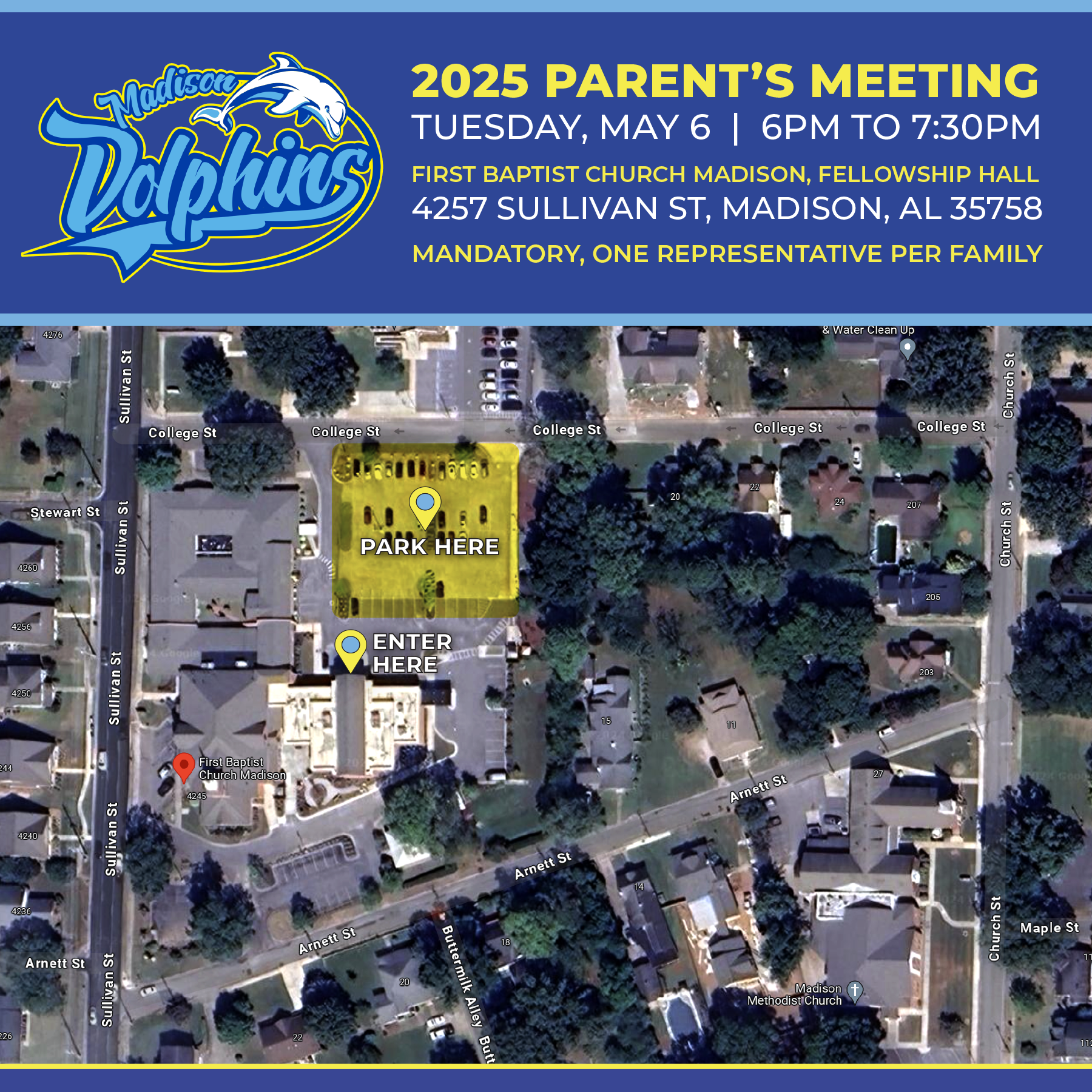 | 2025 Madison Dolphins Information Sheet Welcome to Madison Dolphins Swim and Dive team. Thank you for coming to tryouts for the team. Most of the information you will need can be found on the team website www.madisondolphins.org. We will try and post the team roster on the website late Saturday/Sunday, once the coaches have managed to finalize the team. If your child has made the team please go ahead and register them before the parent meeting (details below). The link is on the front page of the website. The fees are $200 for first child and $195 for each sibling thereafter that has made the team. Other fees to expect during season Medal meet entry fees will depend on the number of events your swimmer swims Spectator fee for Districts $10 per athlete There will be a mandatory parent meeting on 6th May at 6.00pm at First Baptist Church Fellowship Hall, Sullivan Street, Madison. You will learn more about the team and buy team swimsuits, caps and t-shirts. You will also sign waivers and need to bring 2 copies of your swimmer/diver's birth certificate. The team practices every morning Monday- Friday. The time will depend on your swimmer’s age and whether they are on team or development. The practice times will be posted on the website. Generally, it is 11 & over 0700-0830, 9-10 0830-0930, 8 & unders 0930-1020. First practice will be Monday 12th May. The first two weeks practice will be after school. Starting Tuesday 27th May, morning practice starts. If you have any question please email [email protected]. Expectations: Swimmers are expected to go to all meets, home and away. Swimmers are expected to swim at the Medal Meet Sat 14th June and at Districts Fri-Sat 11-12 July. Swimmers have to have been to at least 1 dual meets to swim at Districts and Districts is the only meet where they can qualify for State. Districts is being held at Madison this year so everyone is expected to attend. The State meet is being held at Albertville, Fri-Sat July 24-25. Parents are expected to volunteer at the meets home and away. This year we will need everyone at the Medal meet and Districts. The meets cannot be run without the help of all the parents.
