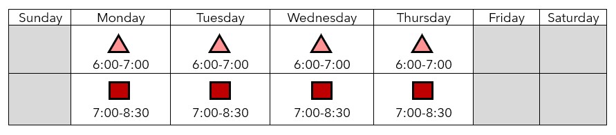- Monday, Tuesday, Wednesday, and Thursday 6:00 PM to 7:00 PM