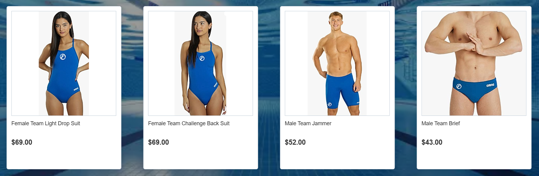 Team swim caps are provided to all swimmers at no charge. Silicone team caps are available for purchase.