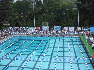 Pool Configuration: 50 meter by 25 yards providing 10 long course (50 meter) lanes or 18 short course (25 yard) lanes. For swim meets, pool is configured as eight, 25 yard lanes.