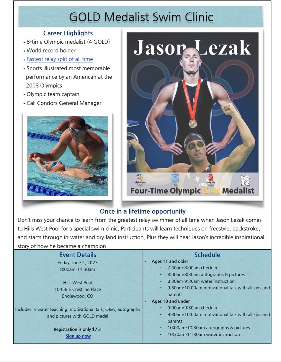 Train with an Olympian Opportunity! Sign up for this special, once in a lifetime opportunity to train with Olympic Gold Medalist, Jason Lezak. This unique event is Fri, June 2 from 8AM-11:30AM at Hills West Pool, 10458 E Crestline Place, Englewood, CO. Cost is $75 per swimmer includes water instruction, autographs and a talk with all the kids and parents. Click here to sign up or for more details. See attached flyer.