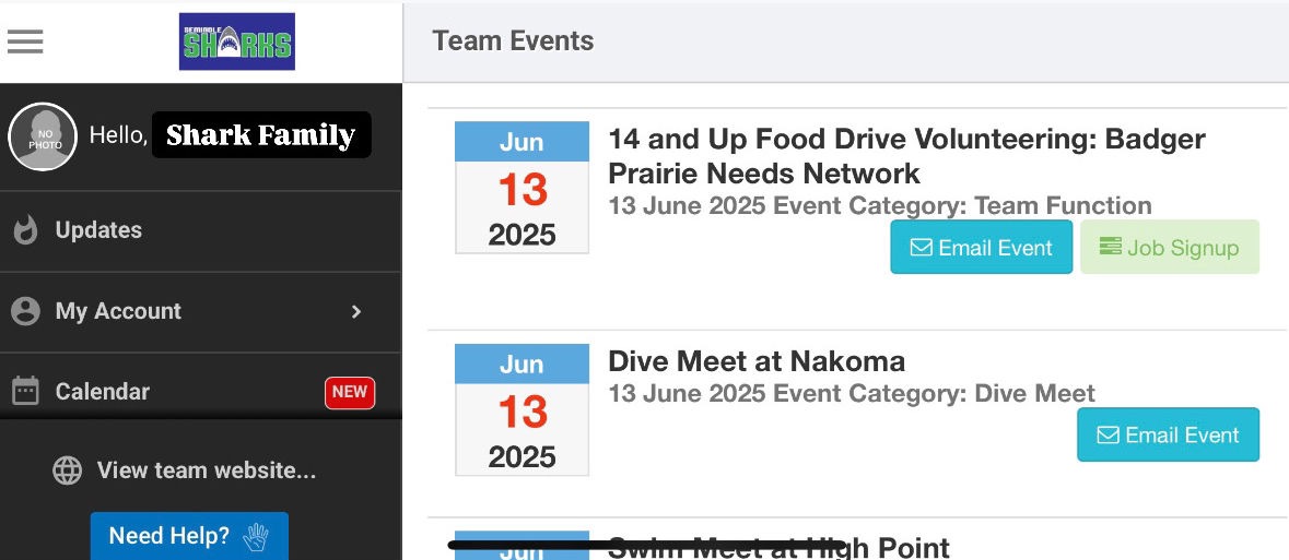 Seminole also uses Team Unify to sign up for volunteer shifts. To find the volunteer shifts, you will sign into team unify just like you do to sign up more meets. Login and then click on the “Events & Competition” tab to the left. Select “Team Events”.