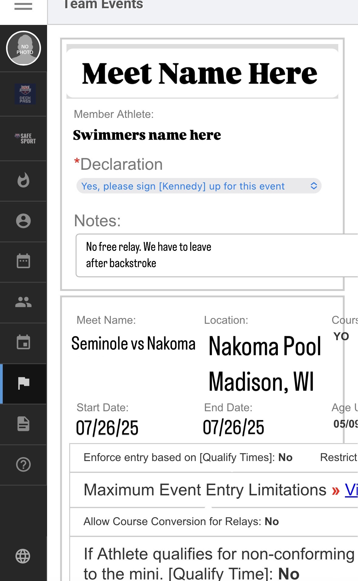 If you have more than one swimmer, you will have to complete this same process of declaring each swimmer and selecting events.