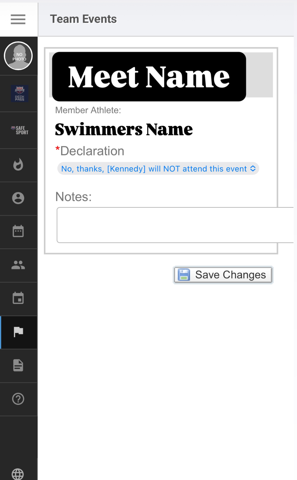 - If your child will not be attending the meet, please select “No thanks, (child) will NOT attend this event". Then SAVE CHANGES! If you do not save changes then it will not register that your child will not be attending.