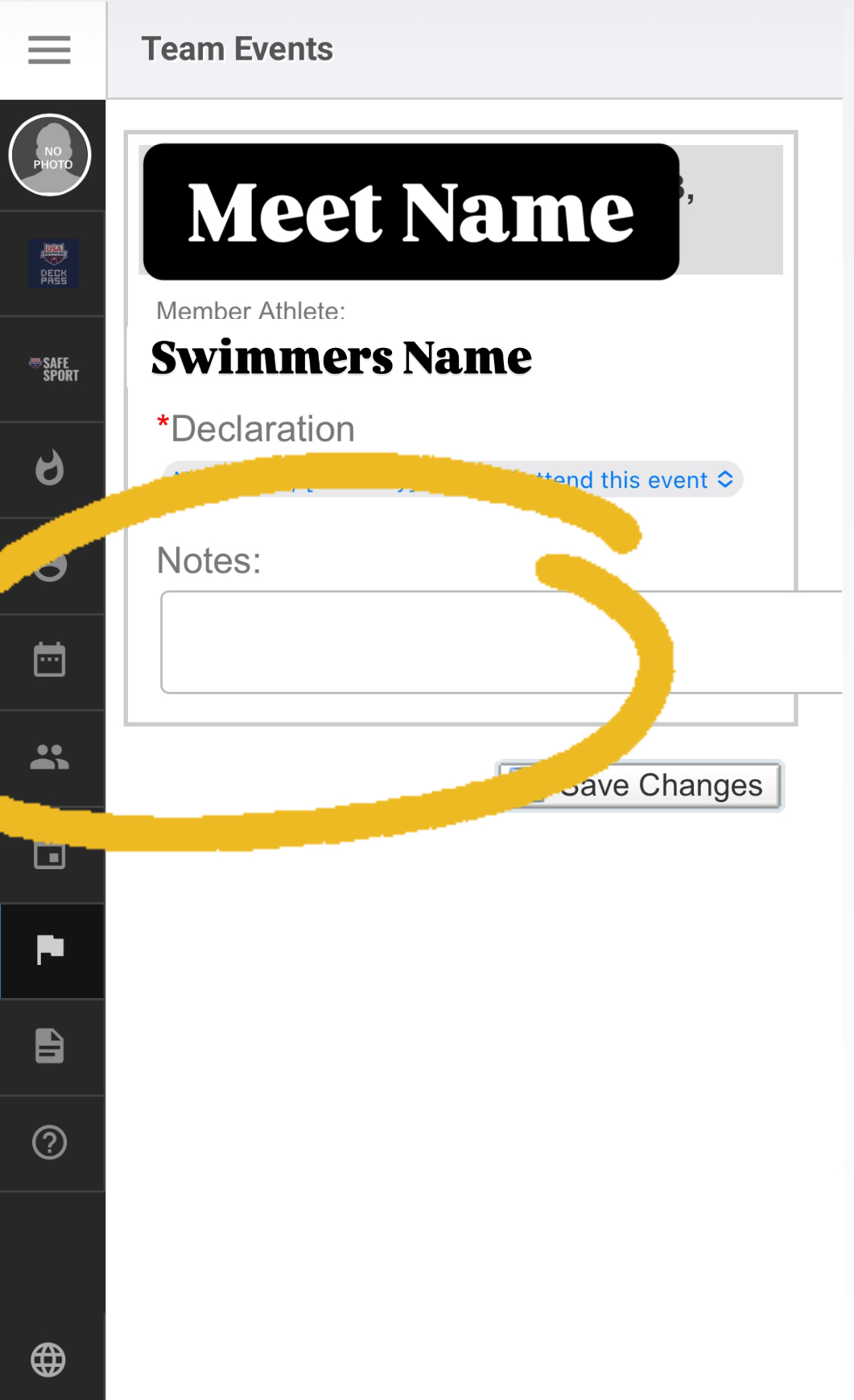 If your child DOES NOT Want to/is unable to swim in a relay, then you have to make note of that in this box! If you leave the box empty or don’t add in anything about relays, coaches WILL sign them up! Don’t forget that you have to then click SAVE CHANGES!