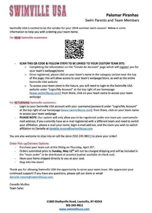 See information above on how to order team suits from Swimville USA. If you are unsure of the size you need Swimville will be at the Clubhouse on Thursday, 4/25 from 5:15-6:15 for fittings. All orders are due by Sunday May 12th in order to get suits here in time for the beginning of the season.