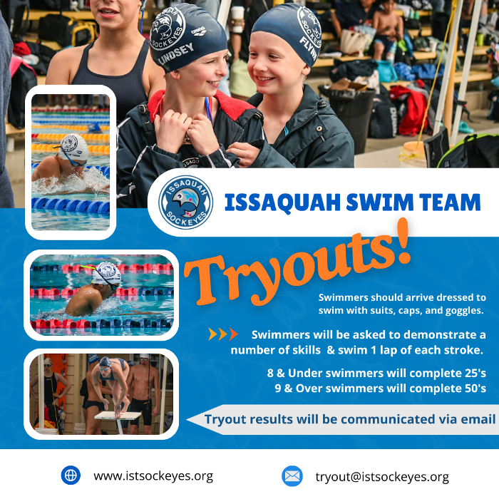 Issaquah Swim Team is excited to host potential new swimmers for tryouts! Please fa the militarize yourself with the Issaquah Swim Team before attending the tryout session. You can find the most current information about their team on their website. istsockeyes.org