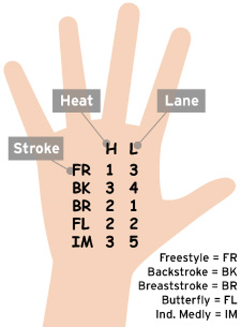 Please make sure to bring a Sharpie marker, so you can write the heats and lanes on your child’s hand. This is a great way for them to learn how the meet works and to make sure they do not miss any races. Please see the example below,