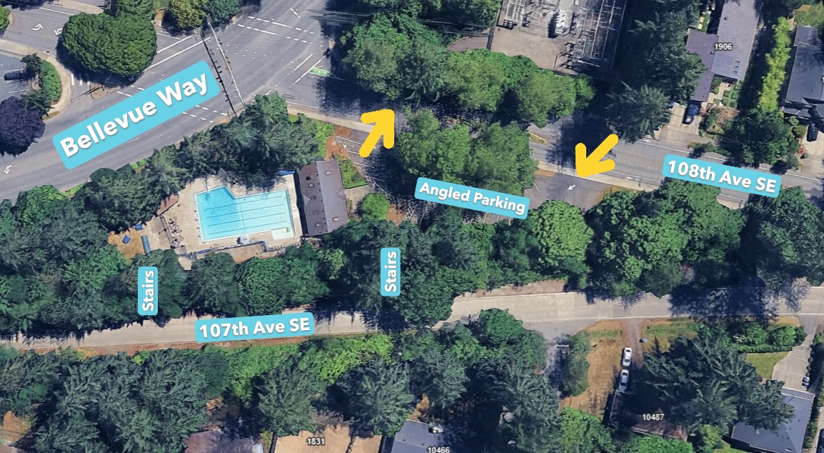 - There is parallel parking available along 107th Avenue. If parking on 107th, the concrete stairs near the parking lot may be used to access the front entrance to the pool during family swim times, swim practice times, and swim meets. During swim meets, the back rustic stairs will also be open for use.