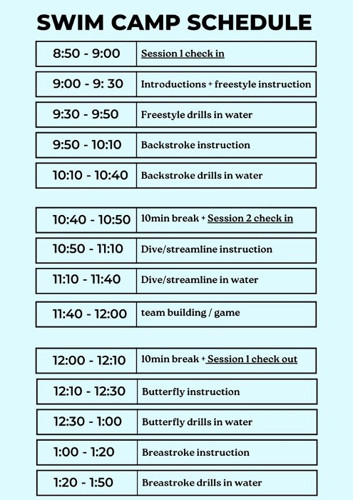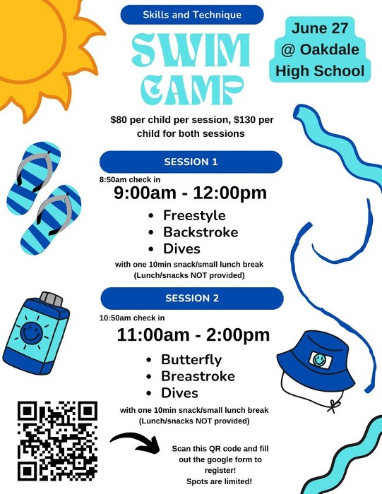 We're excited to share an opportunity to sharpen your swimmer's skills this summer! Coach Kaydence is hosting a one-day swim skills and techniques camp, Coach Kerra will be assisting. There are 2 sessions available, it will be at Oakdale High School, and it's a great way for swimmers to improve their skills and technique. Space is limited.