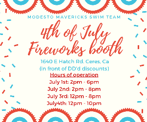 Good afternoon Mavericks families, Our Fireworks Script Fundraiser starts today and runs through June 30th! Fundraising minimums: $50 for families with 1 swimmer $75 for families with 2 or more swimmers You can purchase scripts through this link: https://form.jotform.com/251405626568158 Our fireworks booth will be open for sales July 1st through July 4th, located at: 1640 E Hatch Rd, Ceres, CA (in front of DD’s Discounts) Booth hours are listed on the flyer below (attached/included). Volunteer Shift Sign-Ups An email with the volunteer sign-up link will be sent out tomorrow...