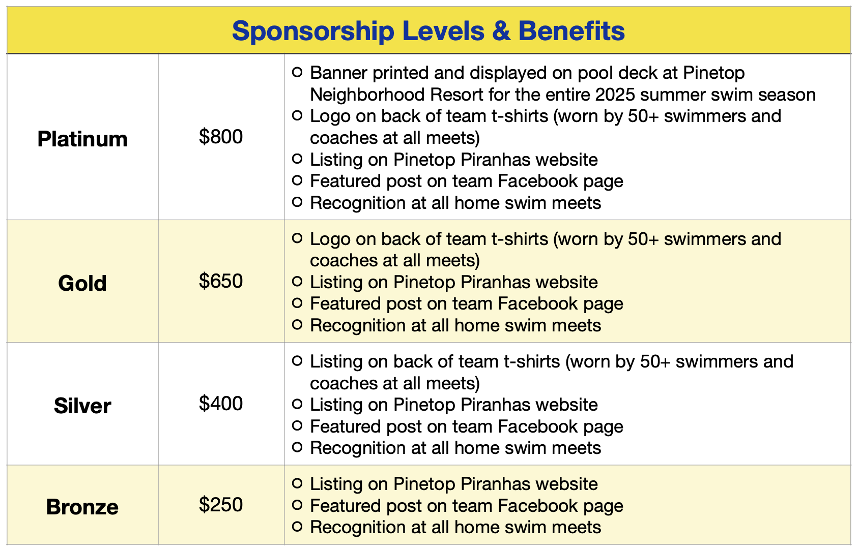 *Families who secure a $400 or more sponsor will get a FREE swimmer registration.*