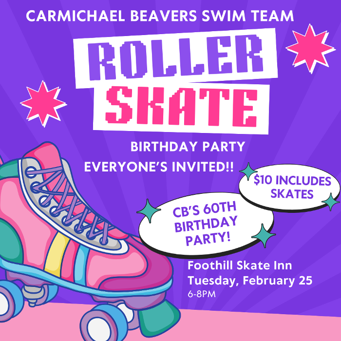 Join us for a night of skating, music, and nonstop fun at Foothill Skate Inn as we celebrate 60 incredible years of the Carmichael Beavers Swim Team! This is a community celebration, so bring everyone—friends, family, neighbors, coworkers, and anyone who loves a good time. CLICK HERE TO PURCHASE YOUR TICKETS!