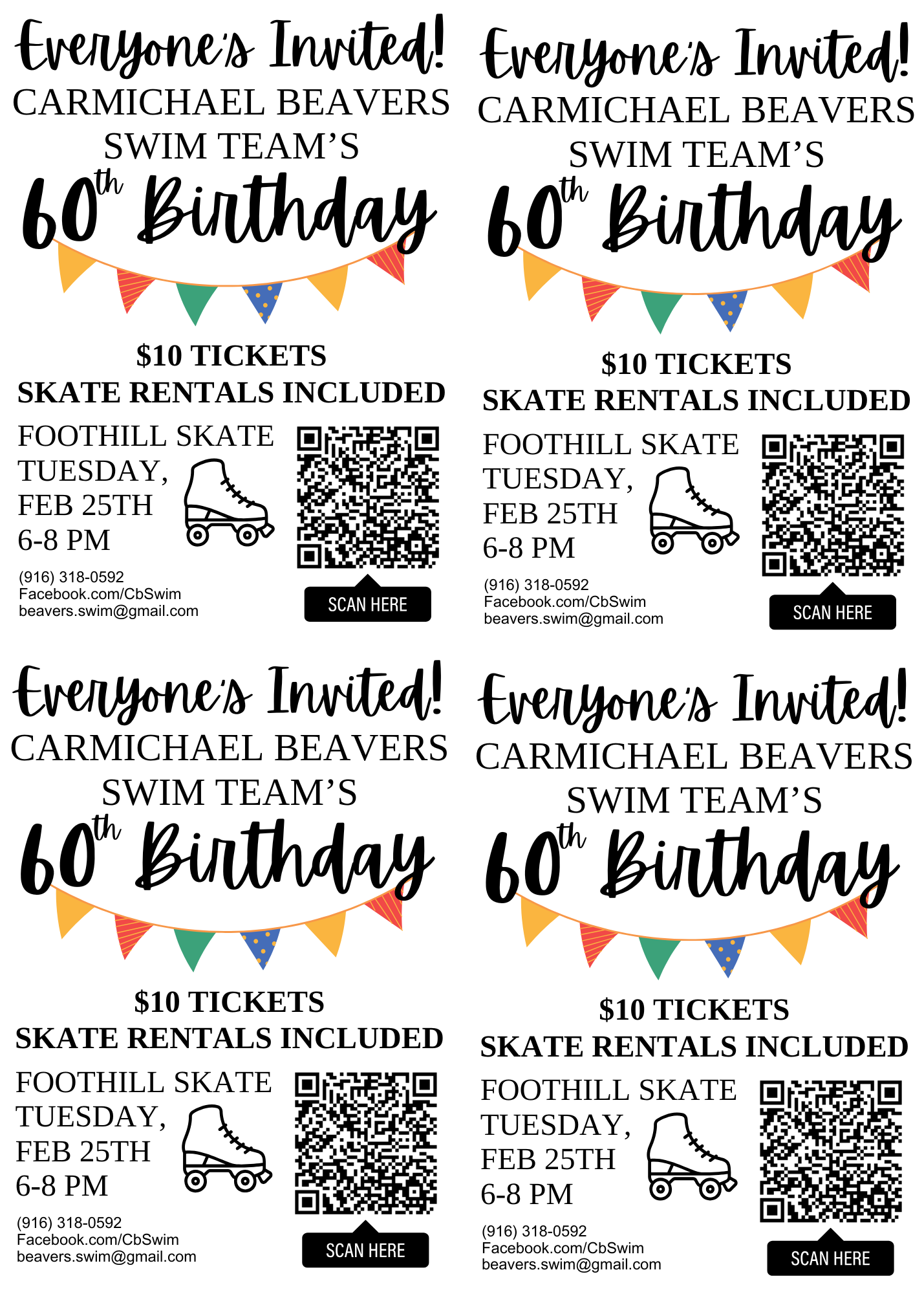 Join us for a night of skating, music, and nonstop fun at Foothill Skate Inn as we celebrate 60 incredible years of the Carmichael Beavers Swim Team! This is a community celebration, so bring everyone—friends, family, neighbors, coworkers, and anyone who loves a good time. CLICK HERE TO PURCHASE YOUR TICKETS!