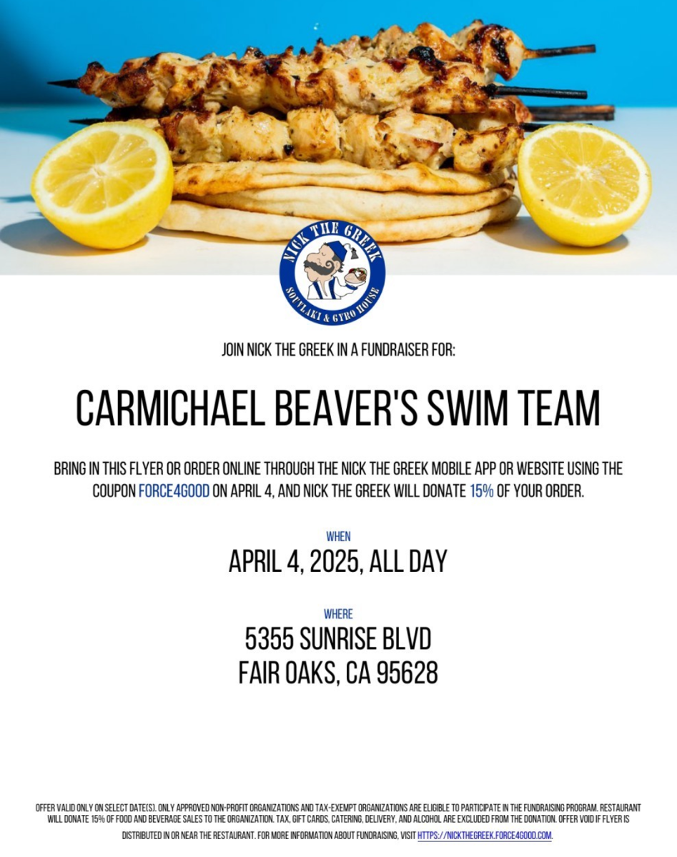 Support the team while enjoying a great meal! On Friday, April 4, 2025, dine at Nick the Greek, and they will generously donate 15% of your order to the Beavers. Simply use the code FORCE4GOOD when ordering online or present the flyer when ordering in person. This is an easy way to support the team while enjoying delicious food—spread the word to family and friends!