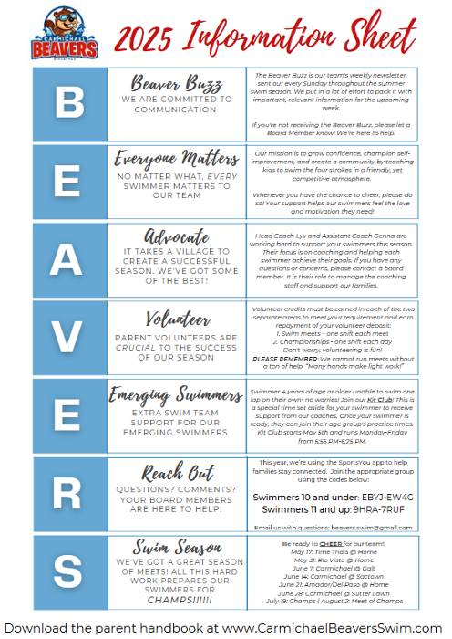 Attached is the 2025 Parent Info Sheet — a fantastic resource to help address many of your questions as we approach the summer. You can also refer to our Family Handbook at any time for additional details.