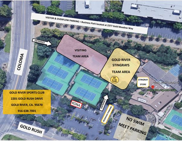 Home team parking in the Gold River Sports Club parking lot will be limited and will be first come, first served. Visiting team and overflow parking for the home team is located directly behind the pool in a business park located at 2377 Gold Meadow Way. There is a gate entrance to the club just east of the parking lot. Please see the map of the club at the bottom of this page for reference.