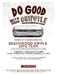 Chipotle will be donating 25% of our supporter's sales on June 24th from 5-9pm at the Crescent Springs location to the Beechwood Swim & Dive Team!